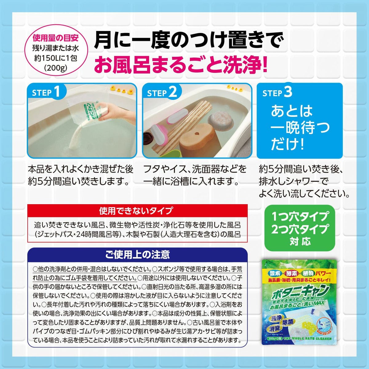 他の画像を見る \天然由来成分100%/風呂釜や風呂桶・風呂いす・ふたなど風呂用品をつけ置きするだけの湯ドロハンターに代わる風呂釜洗浄剤【ホワイトデー プチギフト プレゼント】 ボタニキャン お風呂まるごと!洗いマックス(200g×2包)2個セット 定価 ¥ 1,740 のところ 当店特別価格 ¥ 1,680 税込 カートに入れる お気に入りに登録する