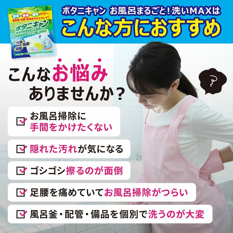 お風呂の残り湯に溶かして5分間追い焚きし、風呂釜や風呂桶・風呂いす・ふたなどのお風呂用品を一緒にひと晩浸けておくだけで、簡単にお風呂掃除ができます。