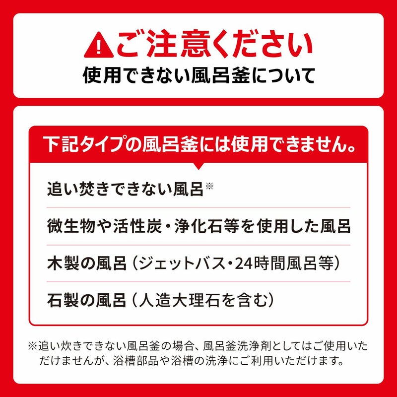 ・古い風呂釜で本体やパイプのつなぎ目・ゴムパッキン部分にひび割れやゆるみが生じ湯アカ・サビ等が詰まっている場合、本品を使うことにより詰まっていた汚れが取れて水漏れすることがあります。