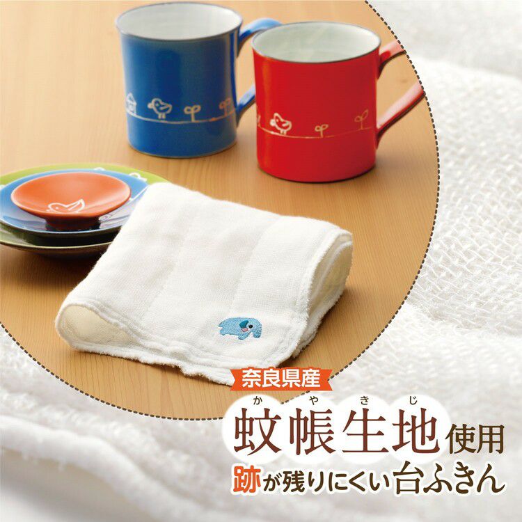 吸水性に優れた日本製の多目的「蚊帳ふきん」です。