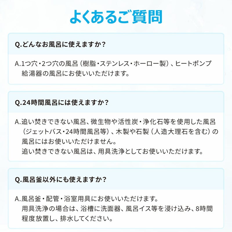 お風呂の残り湯に溶かして5分間追い焚きし、風呂釜や風呂桶・風呂いす・ふたなどのお風呂用品を一緒にひと晩浸けておくだけで、簡単にお風呂掃除ができます。