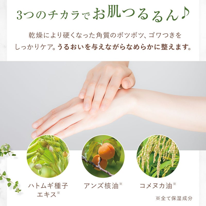 ハトムギ種子エキス・ドクダミエキス・アプリコットオイル(アンズ核油)の3つの力で、乾燥によって固くなった角質のポツポツ、ガサガサや毛穴の目立つお肌をうるおいのあるなめらかなお肌に整えます。
