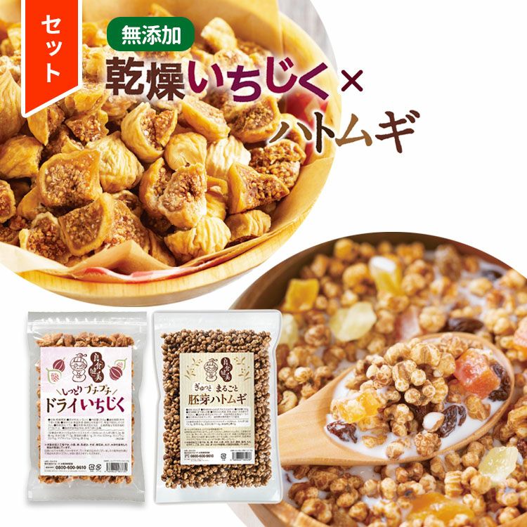 植物性エストロゲン・食物繊維たっぷりの無添加・砂糖不使用のドライいちじくと、シリアル感覚でそのまま食べられる胚芽付きハトムギのお得な2個セットです。