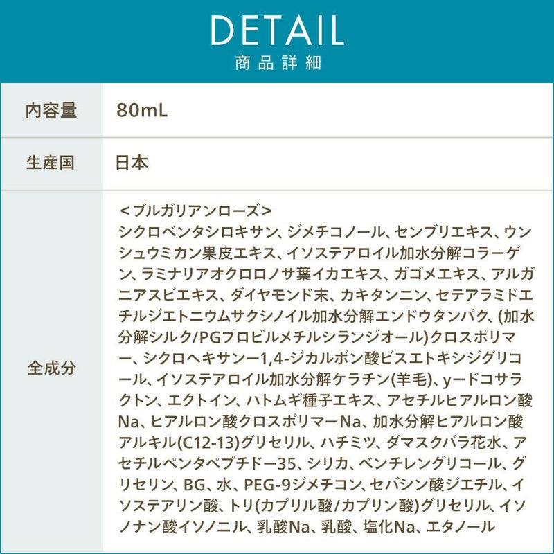 ブルガリアンローズ:シクロペンタシロキサン、ジメチコノール、センブリエキス、ウンシュウミカン果皮エキス、イソステアロイル加水分解コラーゲン、ラミナリアオクロロノサ葉イカエキス、ガゴメエキス、アルガニアスピエキス、ダイヤモンド末、カキタンニン、セテアラミドエチルジエトニウムサクシノイル加水分解エンドウタンパク、(加水分解シルク/PGプロピルメチルシランジオール)クロスポリマー、シクロヘキサン-1,4-ジカルボン酸ビスエトキシジグリコール、イソステアロイル加水分解ケラチン(羊毛)、γ-ドコサラクトン、エクトイン、ハトムギ種子エキス、アセチルヒアルロン酸Na、ヒアルロン酸クロスポリマーNa、加水分解ヒアルロン酸アルキル(C12-13)グリセリル、ハチミツ、ダマスクバラ花水、アセチルペンタペプチド-35、シリカ、ペンチレングリコール、グリセリン、BG、水、PEG-9ジメチコン、セバシン酸ジエチル、イソステアリン酸、トリ(カプリル酸/カプリン酸)グリセリル、イソノナン酸イソノニル、乳酸Na、乳酸、塩化Na、エタノール
