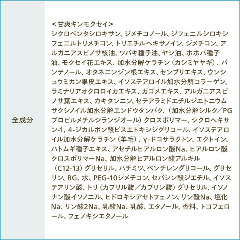 甘爽キンモクセイ:シクロペンタシロキサン、ジメチコノール、ジフェニルシロキシフェニルトリメチコン、トリエチルヘキサノイン、ジメチコン、アルガニアスピノサ核油、ツバキ種子油、ヤシ油、ホホバ種子油、モクセイ花エキス、加水分解ケラチン(カシミヤヤギ)、パンテノール、オタネニンジン根エキス、センブリエキス、ウンシュウミカン果皮エキス、イソステアロイル加水分解コラーゲン、ラミナリアオクロロイカエキス、ガゴメエキス、アルガニアスピノサ葉エキス、カキタンニン、セテアラミドエチルジエトニウムサクシノイル加水分解エンドウタンパク、(加水分解シルク/PGプロピルメチルシランジオール)クロスポリマー、シクロヘキサン-1,4-ジカルボン酸ビスエトキシジグリコール、イソステアロイル加水分解ケラチン(羊毛)、γ-ドコサラクトン、エクトイン、ハトムギ種子エキス、アセチルヒアルロン酸Na、ヒアルロン酸クロスポリマーNa、加水分解ヒアルロン酸アルキル(C12-13)グリセリル、ハチミツ、ペンチレングリコール、グリセリン、BG、水、PEG-10ジメチコン、セバシン酸ジエチル、イソステアリン酸、トリ(カプリル酸/カプリン酸)グリセリル、イソノナン酸イソノニル、ヒドロキシアセトフェノン、リン酸Na、塩化Na、リン酸2Na、乳酸Na、乳酸、エタノール、香料、トコフェロール、フェノキシエタノール
