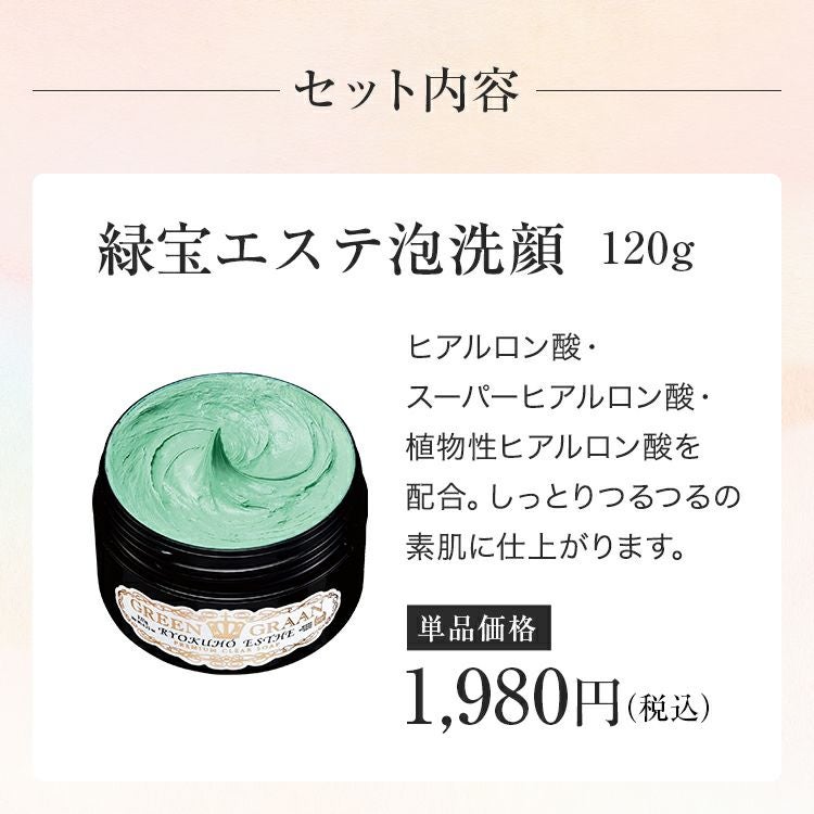 パワーアップしたNo.1洗顔、グリングラン緑宝エステと、ハトムギエキス&ドクダミエキス配合のオールインワンゲル・ローションの3点セットです。