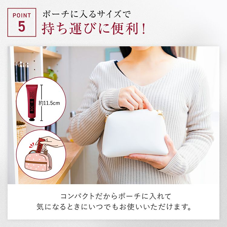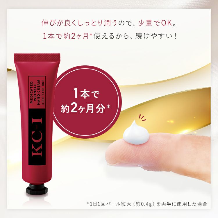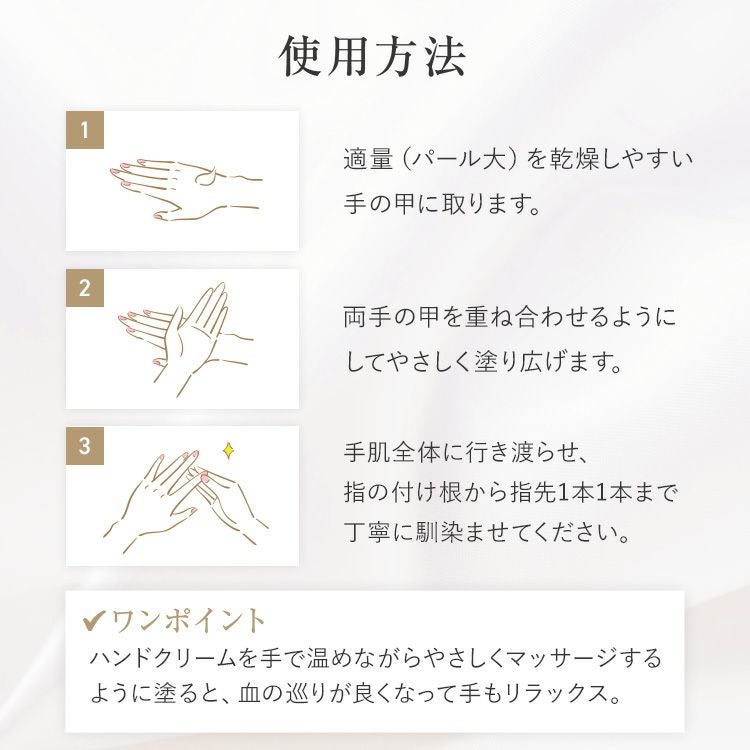 適量(パール大)を取り、手肌全体に薄く塗布し、ムラにならないようしっかりと馴染ませてください。