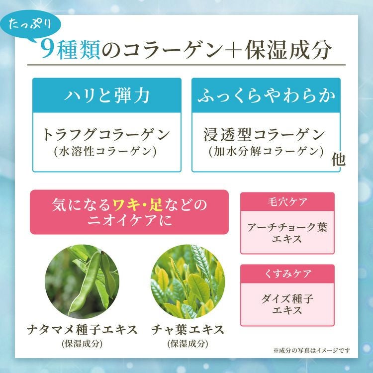 水、BG、グリセリン、(アクリレーツ/アクリル酸アルキル(C10-30))クロスポリマー、PEG-5ステアリルアンモニウムクロリド、水溶性コラーゲン、加水分解コラーゲン、アテロコラーゲン、サクシノイルアテロコラーゲン、ナットウガム、水溶性プロテオグリカン、ヒメフウロエキス、ビルベリー葉エキス、アーチチョーク葉エキス、アスコルビルグルコシド、アロエベラ葉エキス、シロキクラゲ多糖体、カキタンニン、ナタマメ種子エキス、チャ葉エキス、ティーツリー葉油、ノイバラ果実エキス、ダイズ種子エキス、グリコール酸、リンゴ酸、乳酸、シリカ、シクロヘキサン-1,4-ジカルボン酸ビスエトキシジグリコール、グリチルリチン酸2K、グレープフルーツ果皮油、プロパンジオール、コメデンプン、パルミチン酸グリセリル、ラウリルベタイン、乳酸Na、トコフェロール、フェノキシエタノール